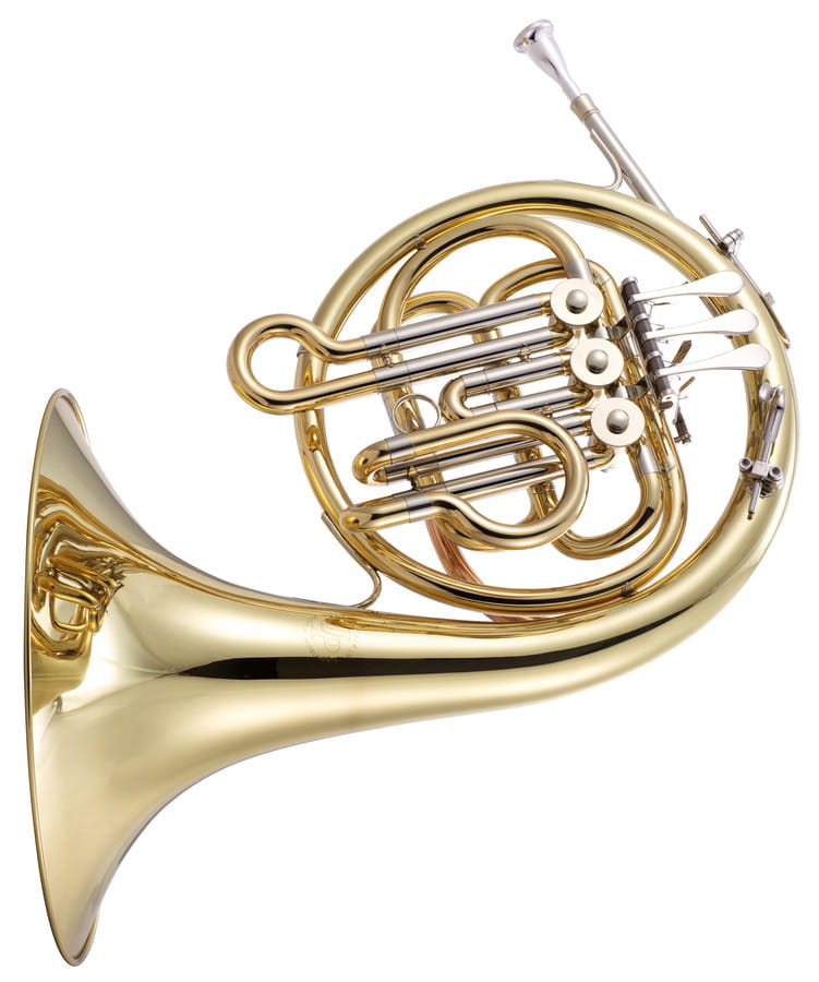 The JP161 single French horn is designed for children, featuring a 'small wrap' to make it smaller than a full-size horn. This design allows a child to put their right hand correctly into the bell while maintaining the proper posture for playing. The JP161 is the Bb side, and its counterpart, the JP162, is the F side. Both horns read horn in F music and transpose a 5th.