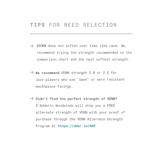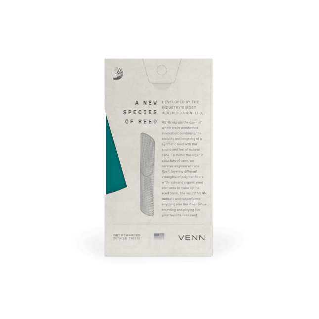 D'Addario VENN: zaawansowany syntetyczny stroik skonstruowany z włókien polimerowych, żywicy oraz naturalnych elementów trzciny. Zaprojektowany, aby zapewnić muzykom korzyści syntetycznych stroików, nie rezygnując z dźwięku i grywalności stroików z drewna.